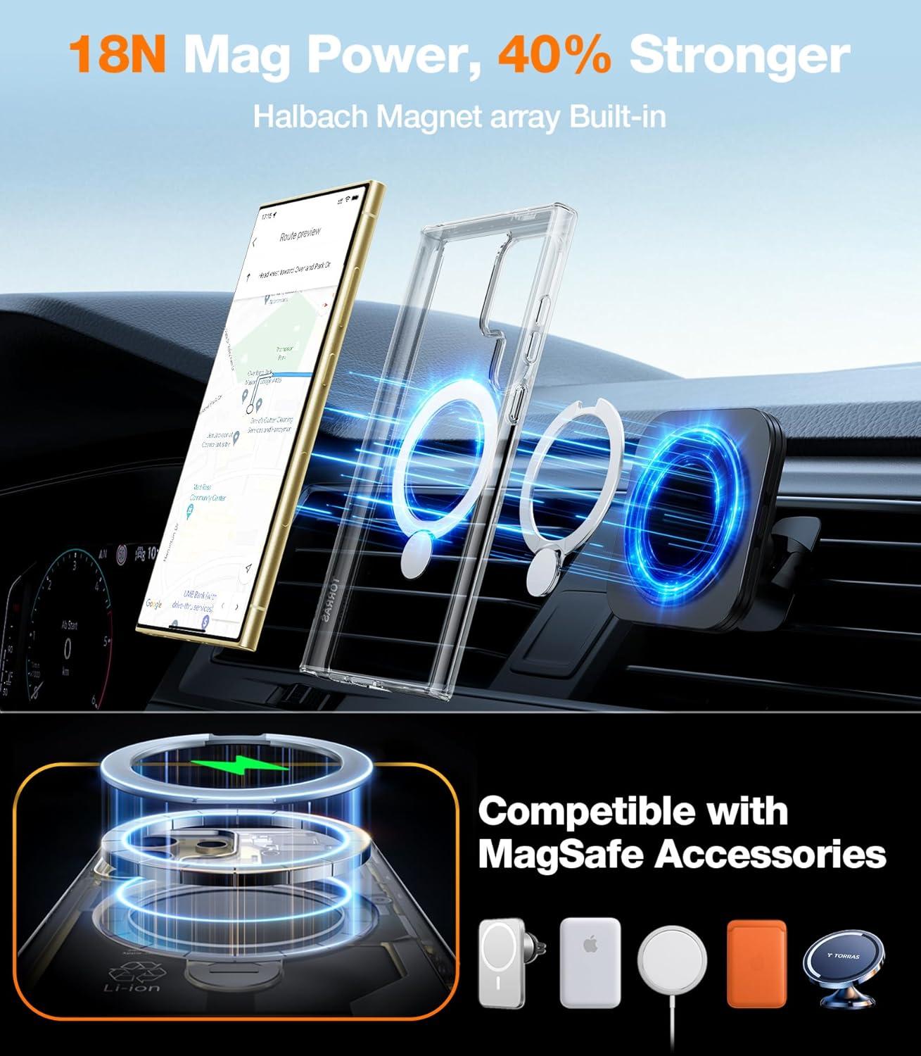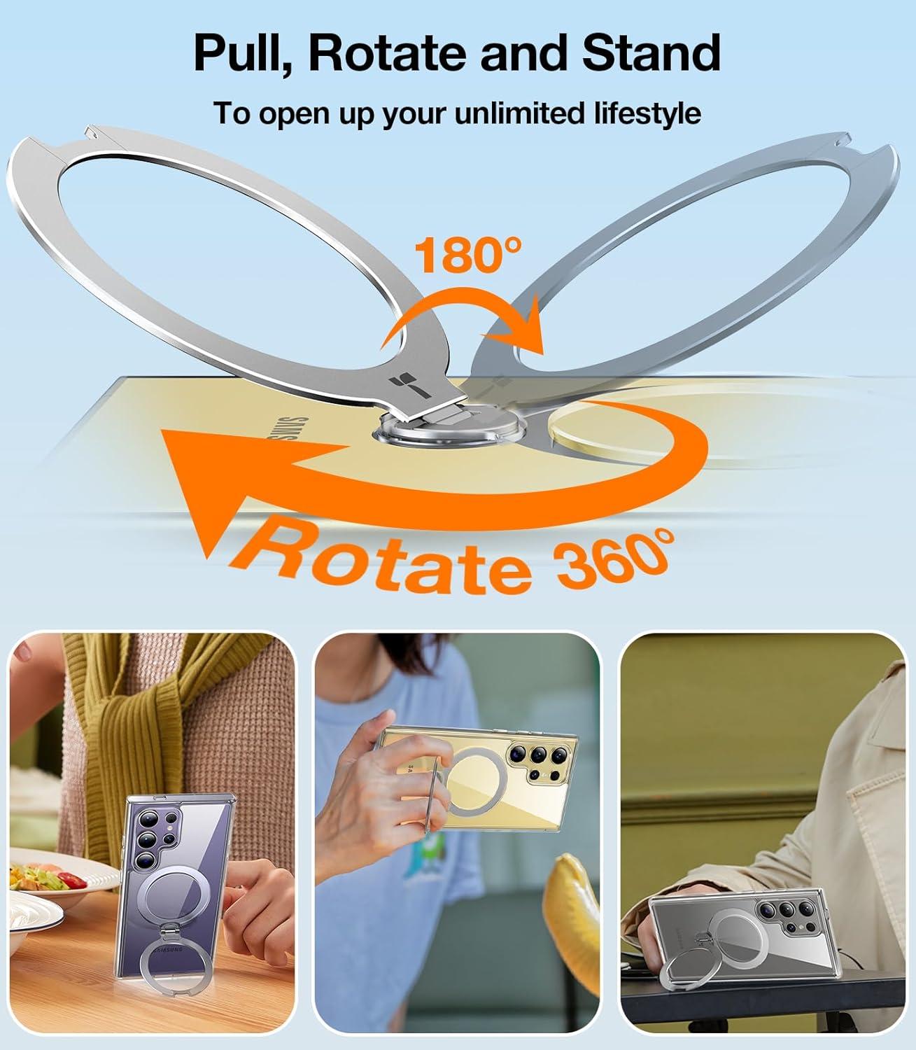 TORRAS 360°Spin Magnetic Stand for Samsung Galaxy S24 Ultra Case, Compatible with Magsafe, Shockproof Military Grade Protective Slim Galaxy S24 Ultra Phone Case with Kickstand & Ring Holder, Purple(Clear)