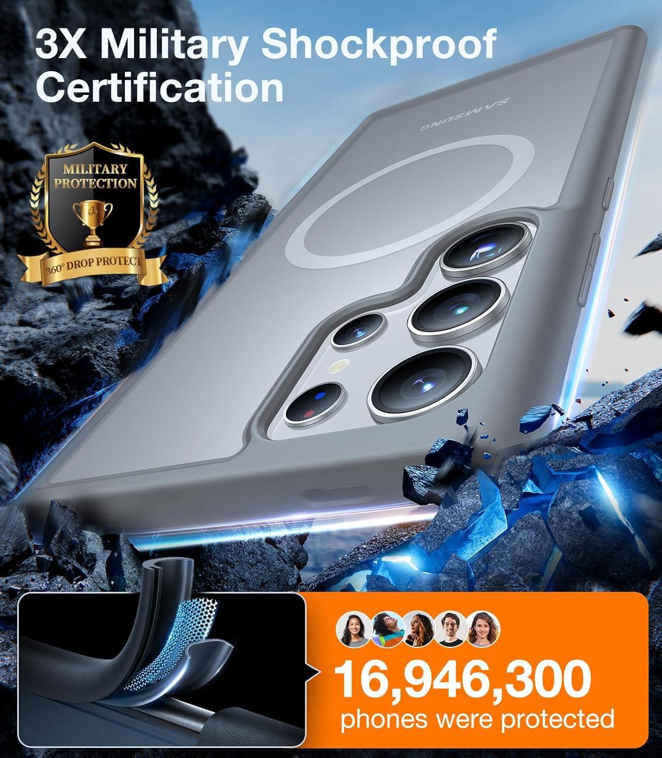 TORRAS Magnetic Shockproof for Samsung Galaxy S25 Ultra Case, Fit for MagSafe, 4X Military Grade Protection, Translucent Slim Case for Samsung S25 Ultra Case Anti-Fingerprint Anti-Scratch, Black(Gray)
