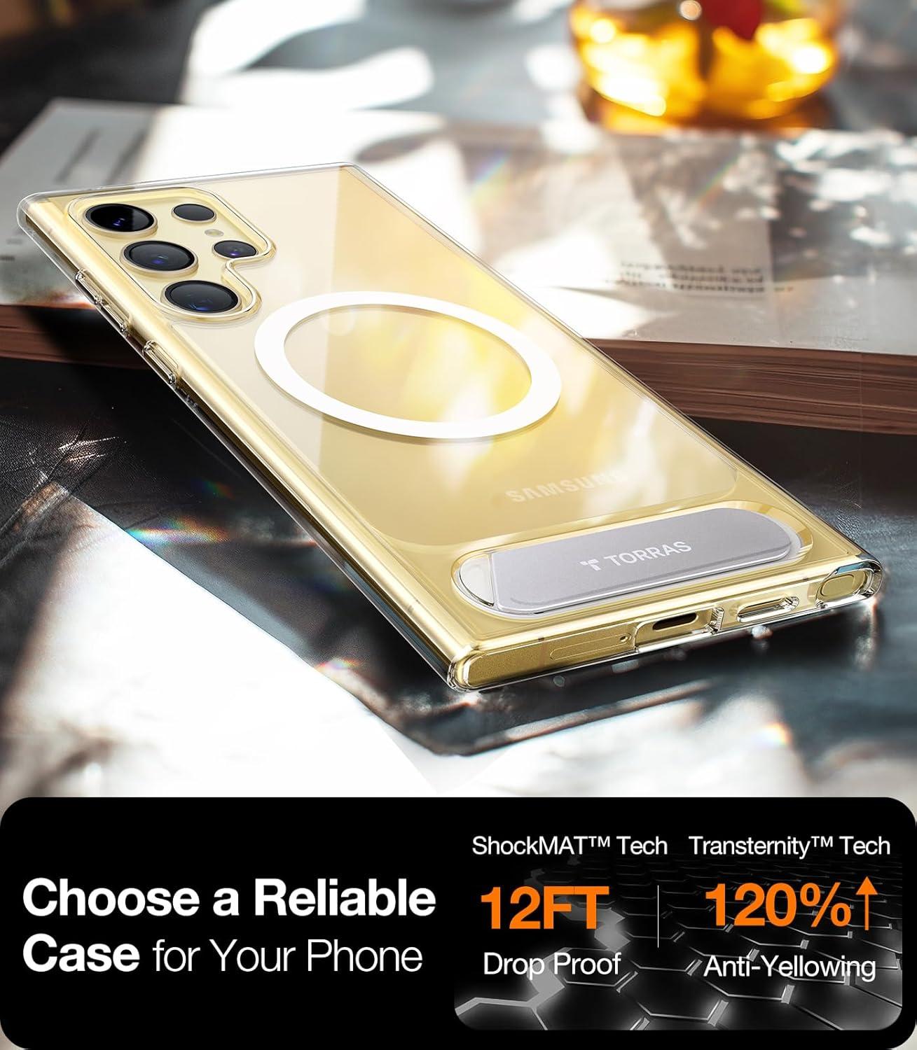 TORRAS Strong Magnetic & Seamless Stand for Samsung Galaxy S25 Ultra Case, Fit for MagSafe, Mil-Grade Drop Protection, Kickstand for Samsung Galaxy S25 Ultra Case, Translucent Back/Black Edge(Clear)