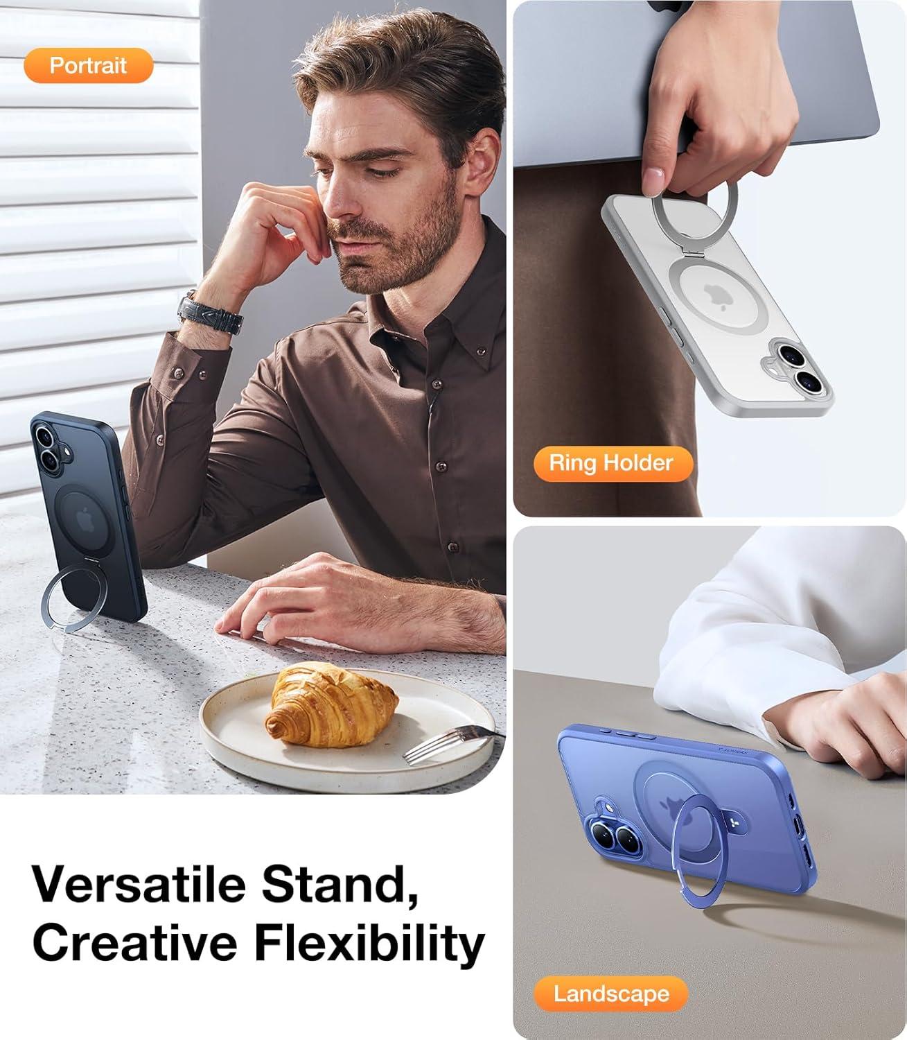 TORRAS Magnetic for iPhone 16 Case with Stand, Built-in Stand Compatible with MagSafe, 3X Military-Grade Protection, Translucent Slim Phone Case for iPhone 16 6.1”, Matte Blue(Orange)