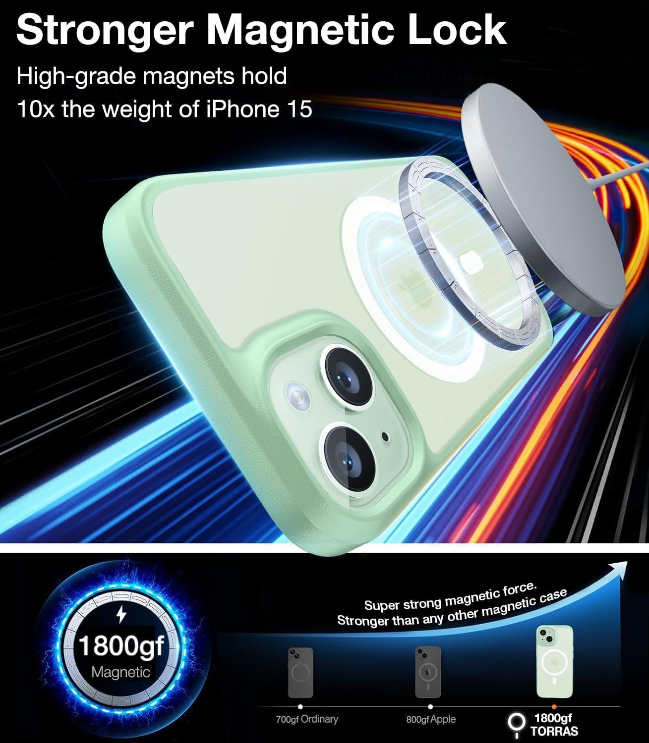 TORRAS Magnetic Shockproof for iPhone 15 Case iPhone 14 Case, 12FT Military Grade Drop Protection, Translucent Slim Protective Anti-Scratch, Black(Green)