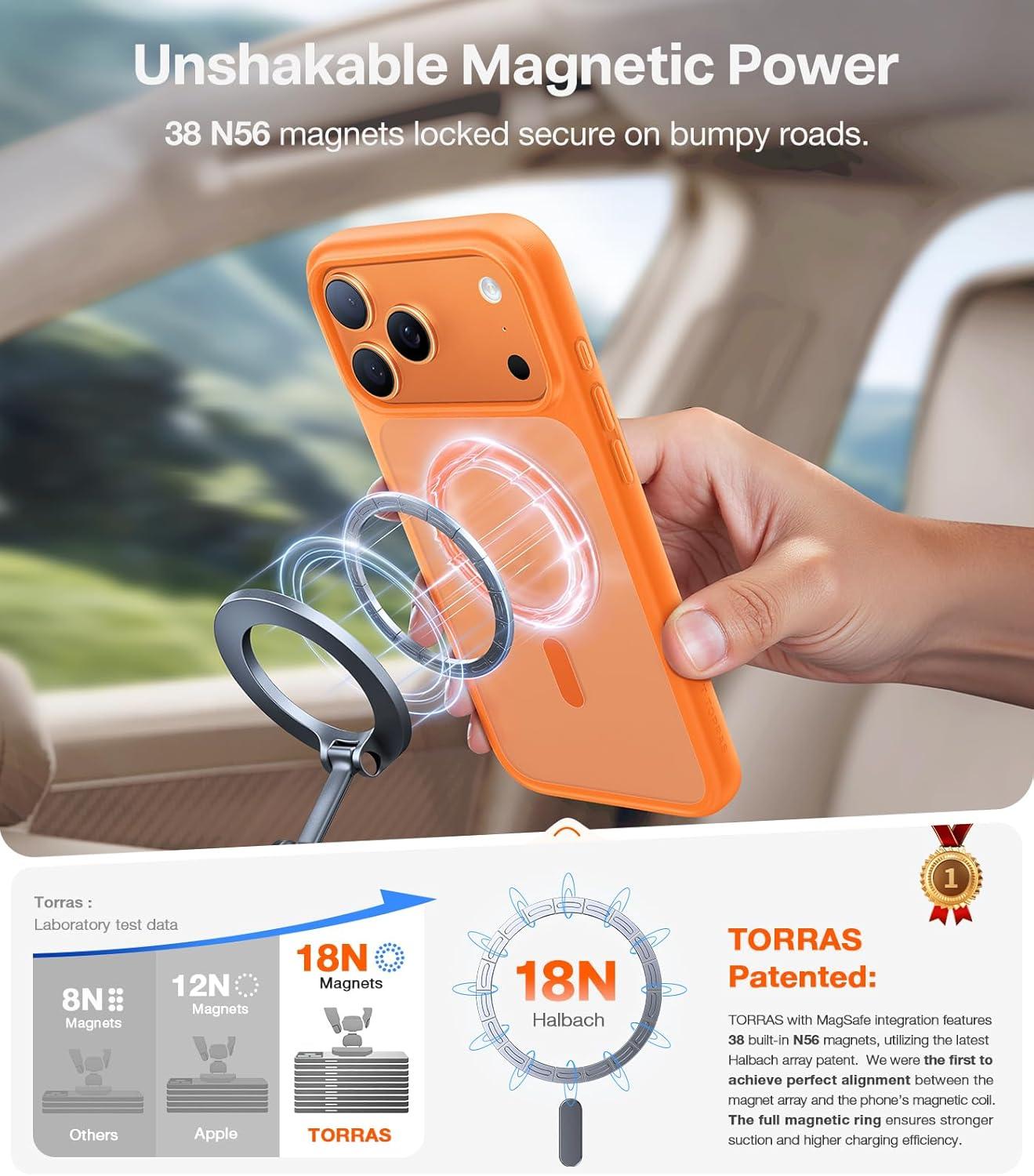 TORRAS Upgrade 360Rotatable Magnetic for iPhone 16 Pro Case 6.3 inch, Fit for MagSafe 16 Pro Phone Case, 16FT Mil-Grade Shockproof, Flush Stand Ring Holder, Translucent Slim Protective Ostand, Black(Neon Orange)