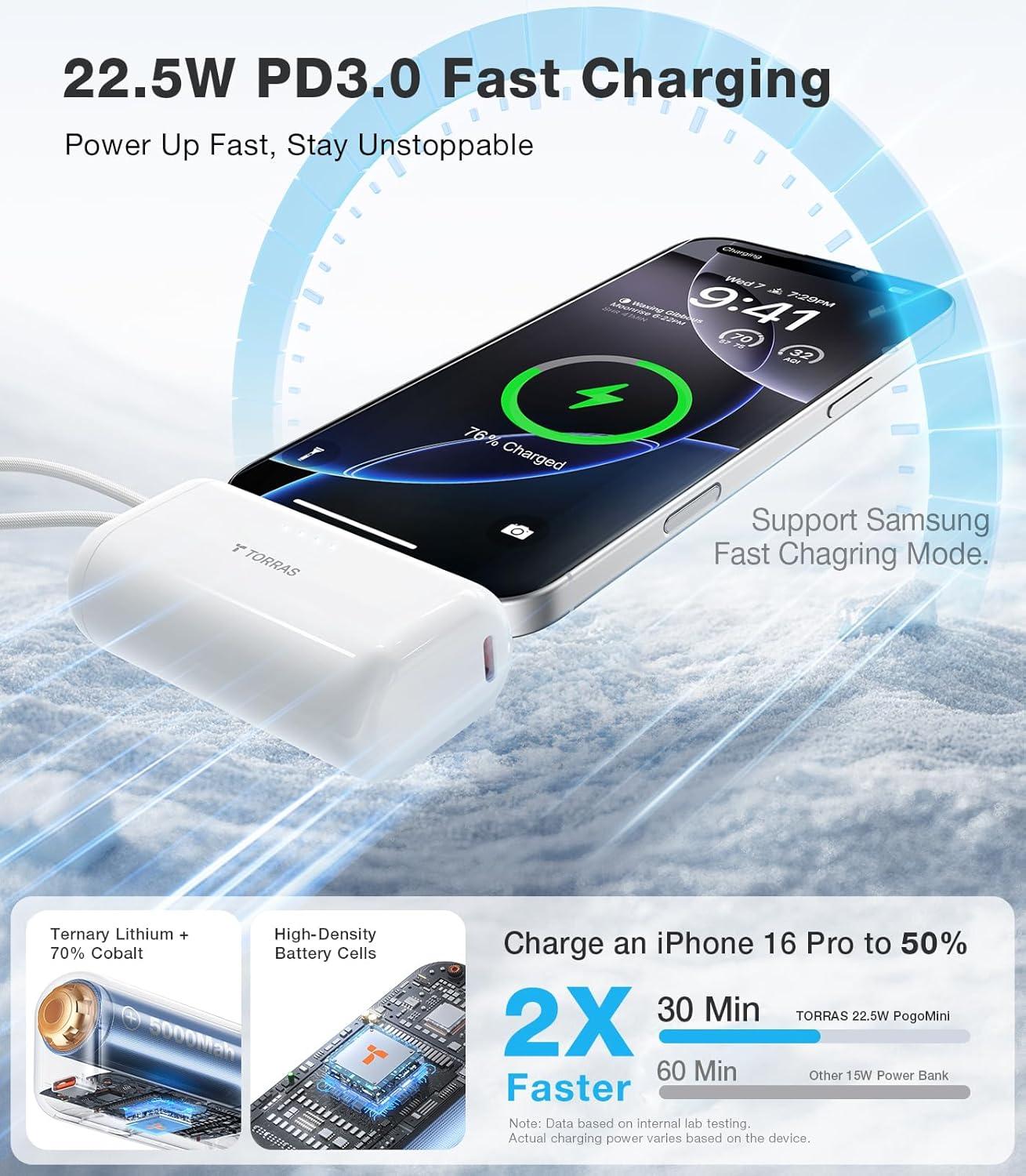 TORRAS 2-in-1 iPhone 16 Portable Charger, 5,000mAh 22.5W Mini Power Bank with Built-in USB-C Cable, Fast Charge Battery Pack, Travel Essential for iPhone 17/16/15, Galaxy S25, Google – Desert Titanium(Arctic White)