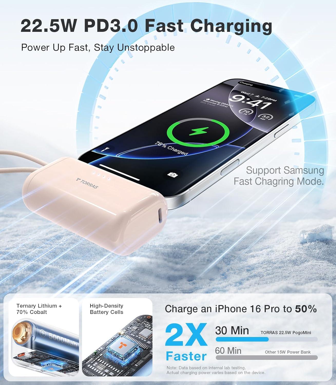 TORRAS 2-in-1 iPhone 16 Portable Charger, 5,000mAh 22.5W Mini Power Bank with Built-in USB-C Cable, Fast Charge Battery Pack, Travel Essential for iPhone 17/16/15, Galaxy S25, Google – Desert Titanium(White)