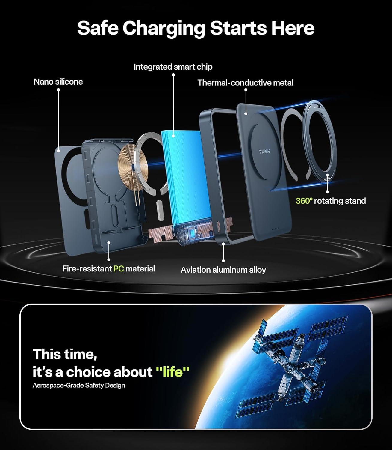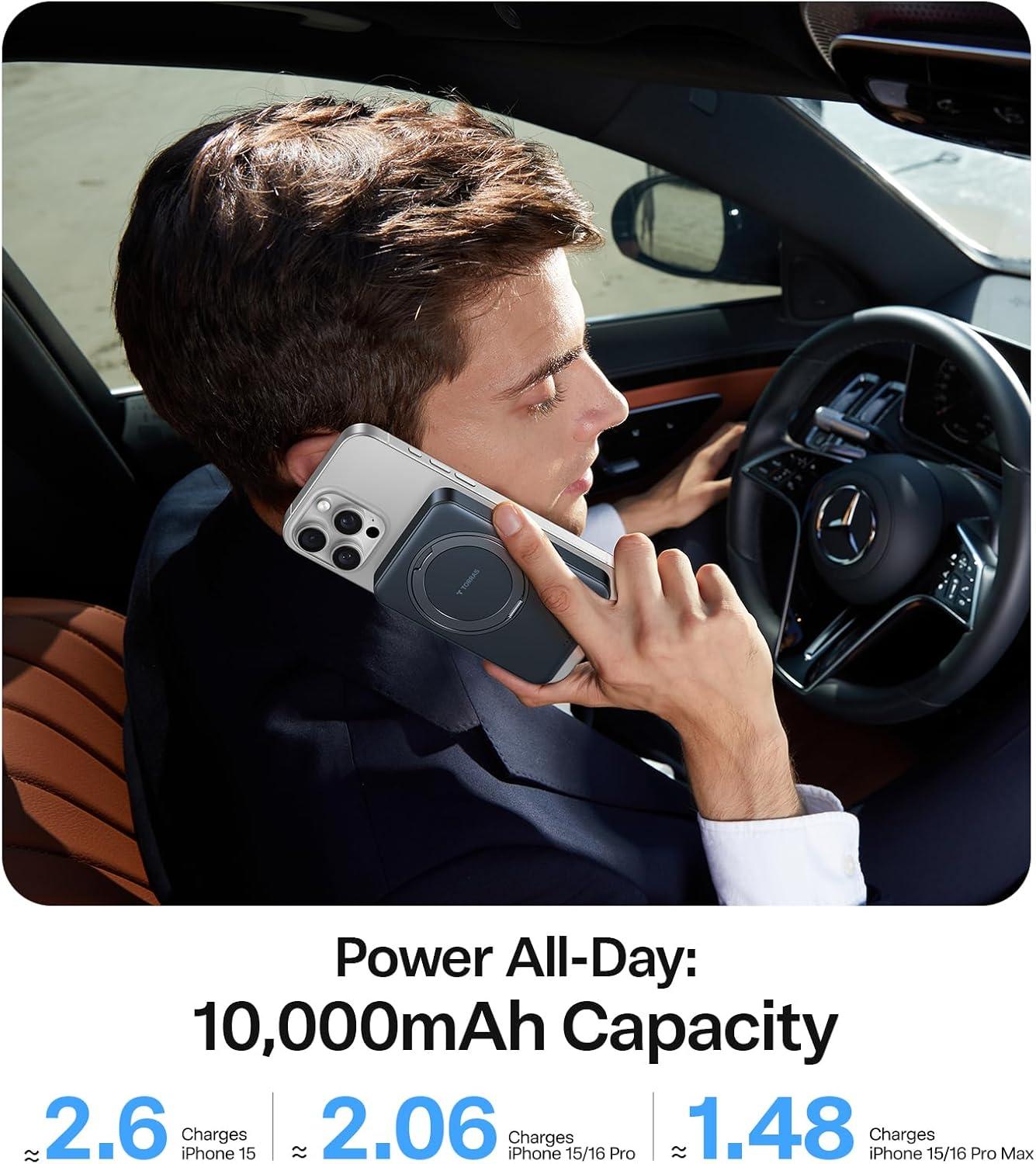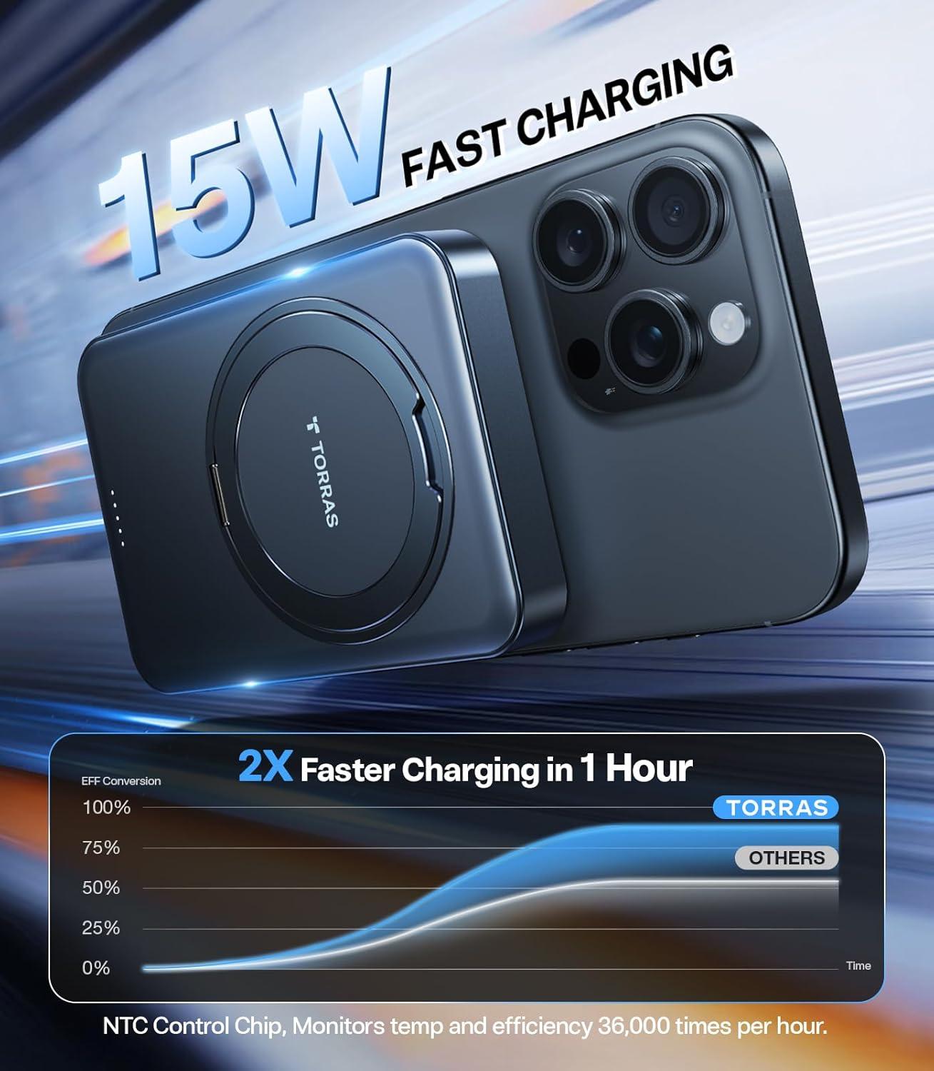 TORRAS 10,000mAh, Qi2 Certified,15W Fast Wireless Portable Charger with USB C Cable, 20W in/Out Wired Charging Power Bank with Stand, Magnetic Battery Pack for iPhone 17 Pro Max/16/15/14/13/12(Black)