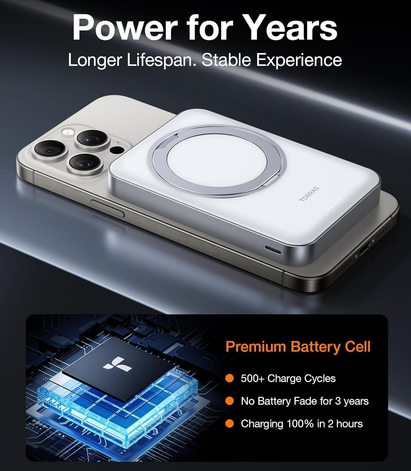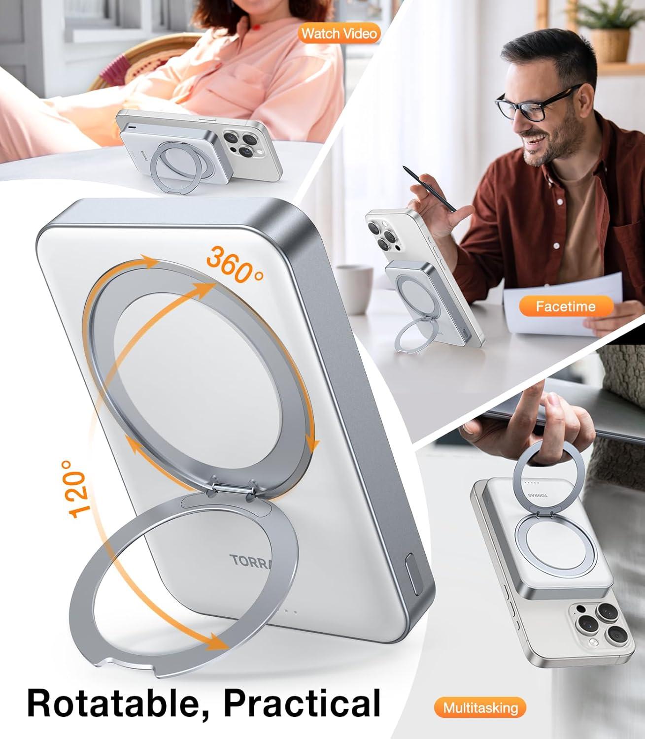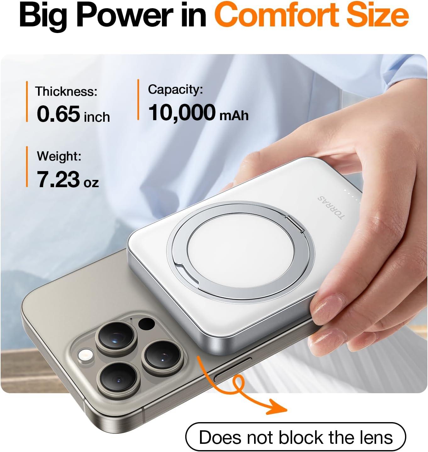 TORRAS 10,000mAh, Qi2 Certified,15W Fast Wireless Portable Charger with USB C Cable, 20W in/Out Wired Charging Power Bank with Stand, Magnetic Battery Pack for iPhone 17 Pro Max/16/15/14/13/12(Whiten Aluminum)