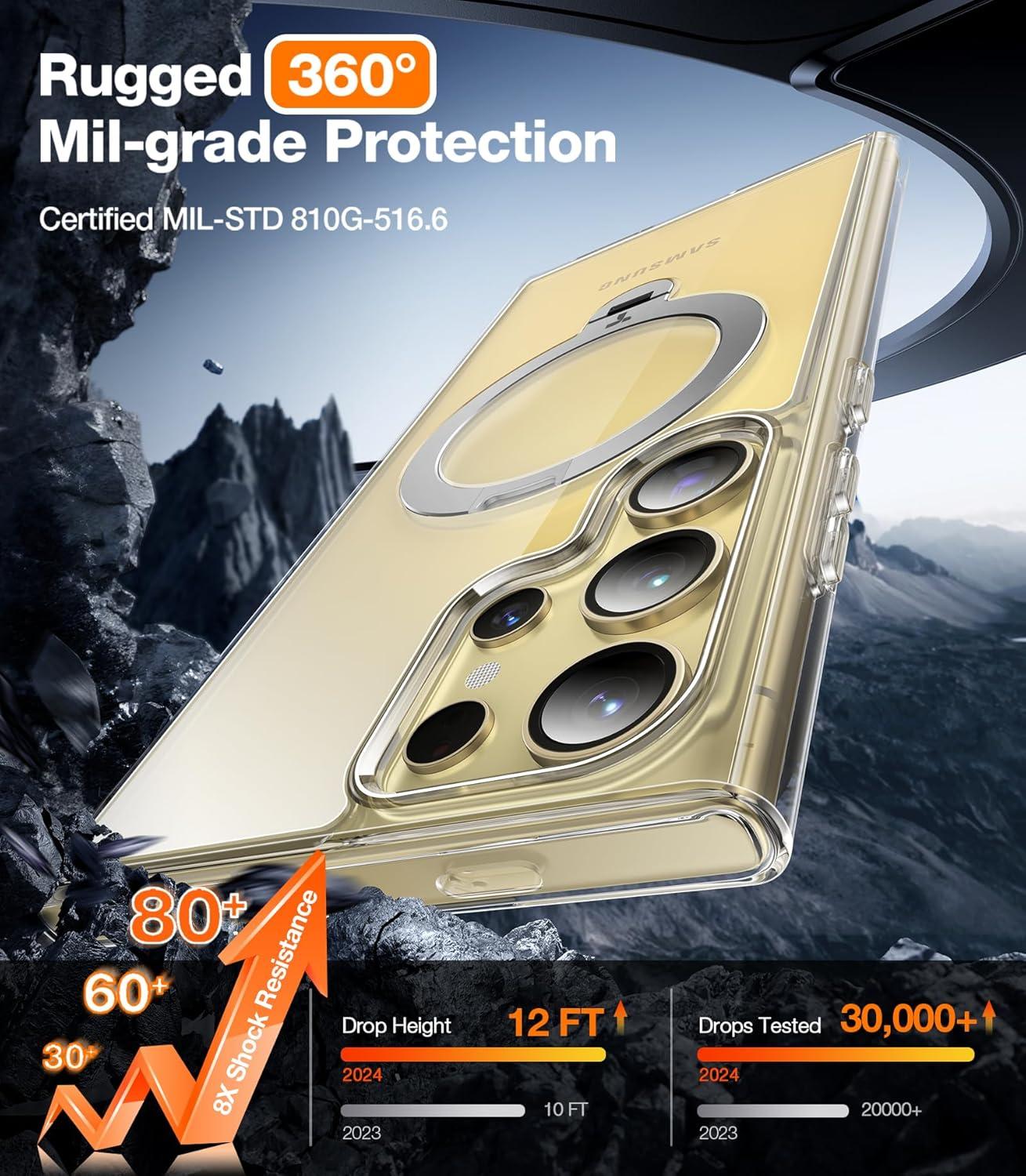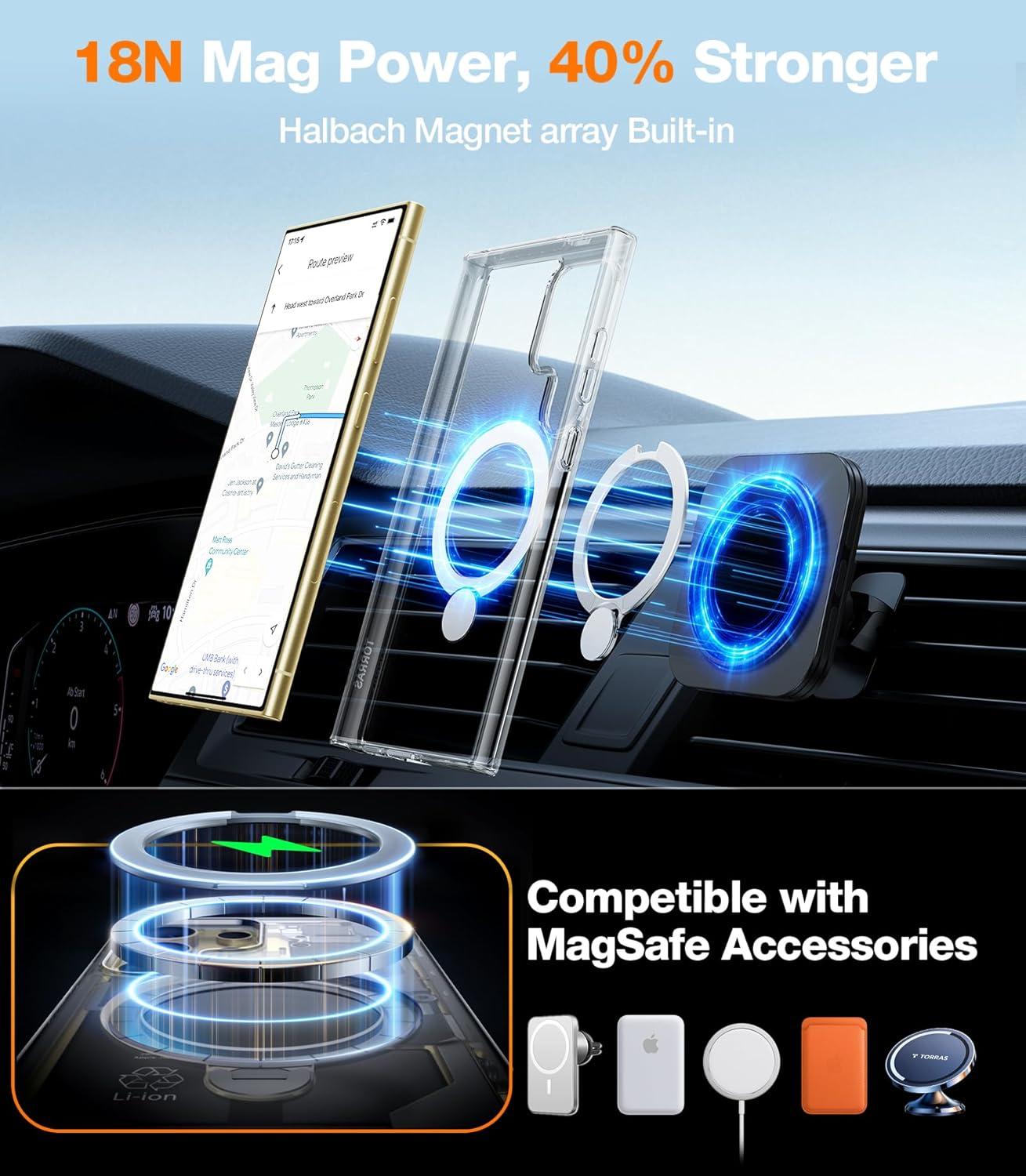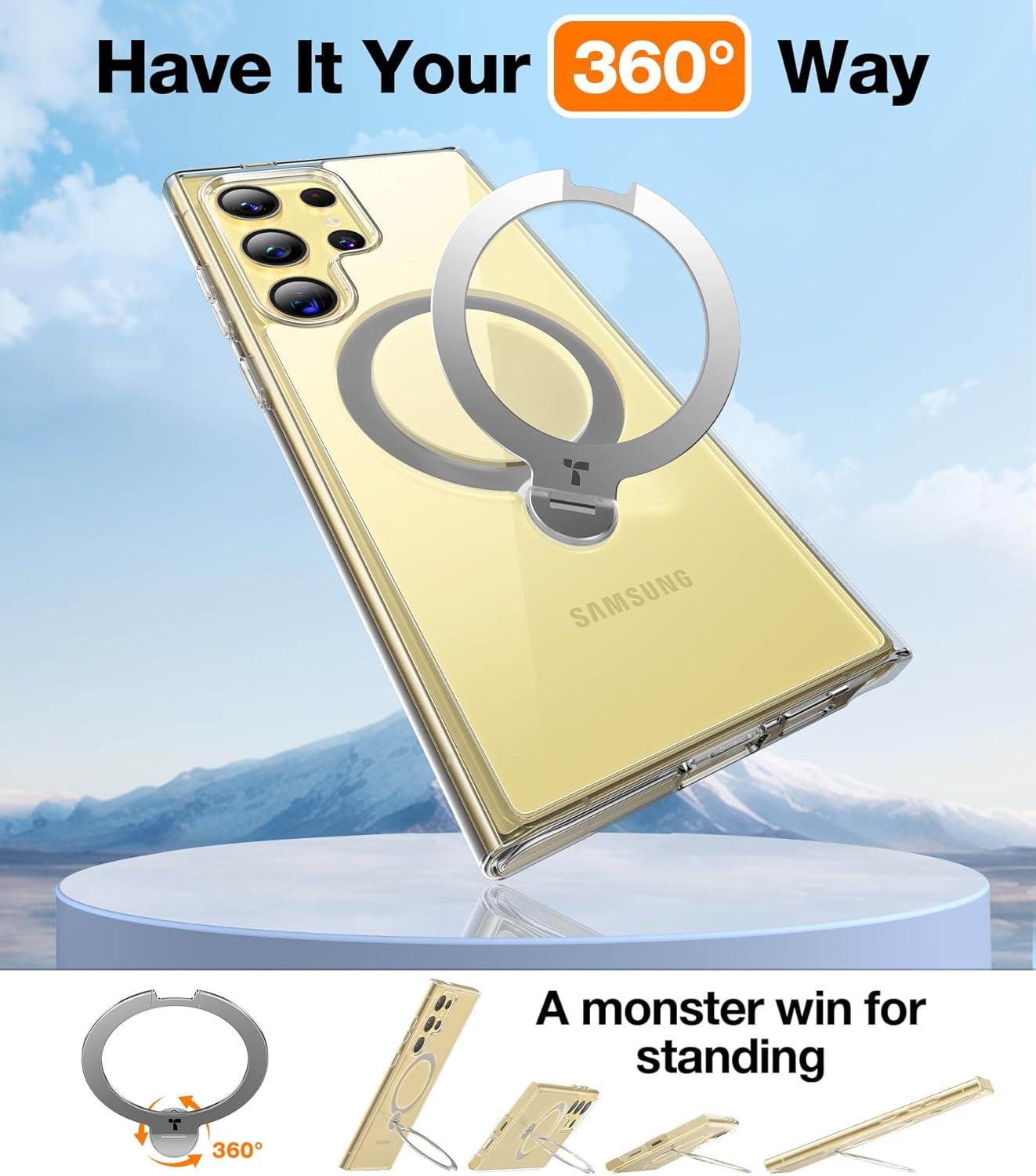 TORRAS 360°Spin Magnetic Kickstand for Samsung Galaxy S24 Ultra Case, Compatible with Magsafe, Transparent Slim Protective S24 Ultra Phone Case with Stand&Ring Holder, Ostand Spin, Clear