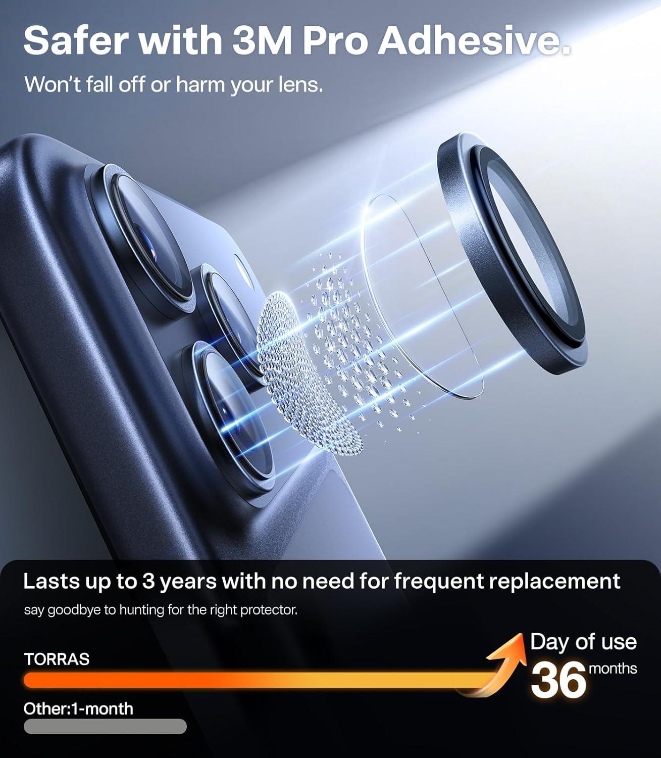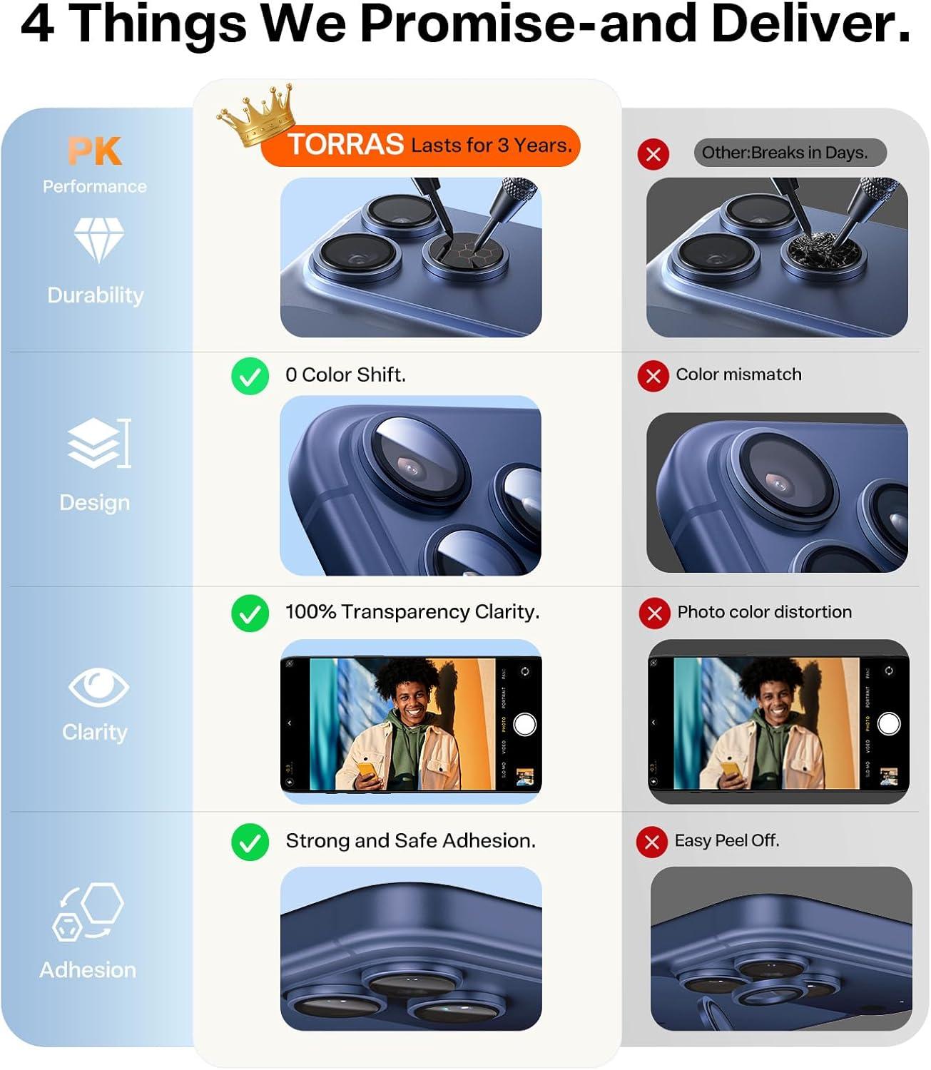 【365-day warranty service.】TORRAS stands firmly behind our customers with a 365-day free replacement guarantee for the iPhone 15 Pro Max/15 Pro lens protectors. If you encounter any issues (installation problems/ cracks/ logistics issues/ incorrect size/ bubbles, or any other concerns) —we're here to help. And installation? Super easy! Done in seconds with a 100% success rate, even for first-time users.