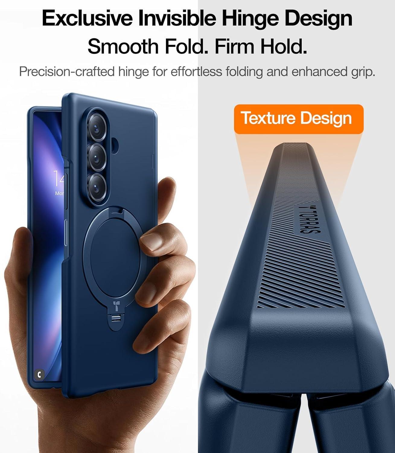 [Secure Grip & Worry-free Design] With an upgraded nano oleophobic coating on the back and edges, this Samsung Galaxy Z Fold 7 case delivers a silky-smooth, skin-friendly touch. A textured hinge cover adds a confident, secure grip. The integrated kickstand lies flat for a clean, streamlined profile—no bulge, no wobble. The front cover installs securely using inner raised dots, no adhesive required—leaving a snug, residue-free fit.