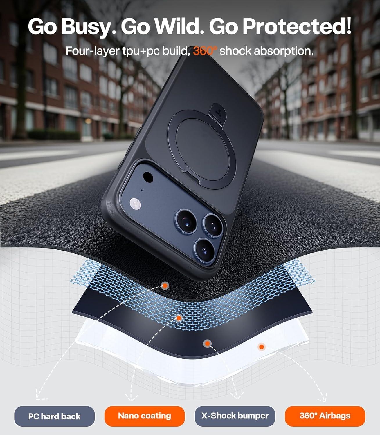 TORRAS 360°Rotatable Magnetic Ring for iPhone 16 Pro Max Case, Fit for MagSafe with Stand & Ring Holder, 16FT Mil-Grade Shockproof Translucent for iPhone 16 Pro Max Phone Case Ostand, Dark Black