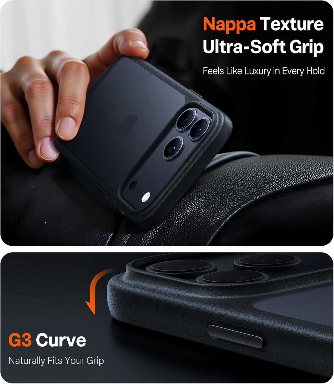 Luxurious Feel & Slim Grip: The TORRAS black case for iPhone 17 Pro case slim exclusive Nappa-textured surface delivers a premium touch while boosting grip by 20%. Slim and lightweight, it eases wrist strain and features an ergonomic G3 curve for a more natural hold. Its sleek profile slips effortlessly into your pocket or bag.