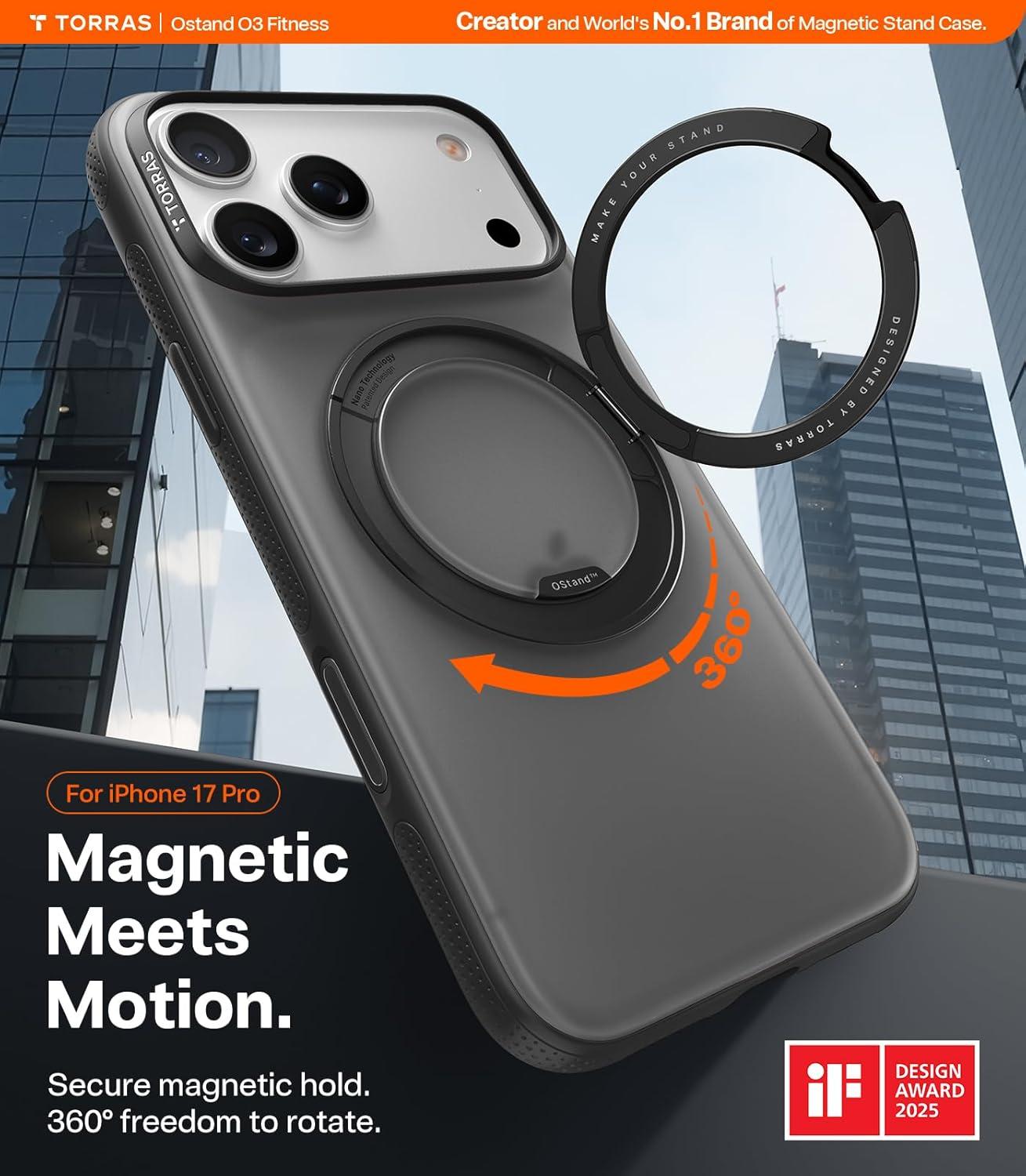 [The Original 360° Magnetic Stand — Redefining Hands-Free Freedom] As the inventor of the 360° magnetic stand case, TORRAS redefines versatility for iPhone 17 Pro Max. Stand vertical for FaceTime calls. Flip horizontal to capture group photos. Tilt 45° for hands-free cooking recipe scans. Each rotation delivers a satisfying, Swiss-engineered click — that signature sound of precision. Ostand O3 Fitness Series frees your hands to create, share, and live.