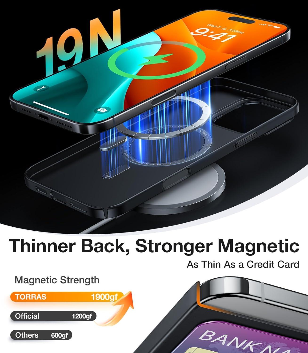 Powerful Magnet Lock: TORRAS for iPhone 16 Pro slim case made of 38 N52 super-strong magnets, it boasts far greater strength(19N) than standard magnets(8N). A powerful magnetic connection keeps the phone safely in place even on bumpy roads. Besides, the embedded magnetic ring will never fall off or crack.