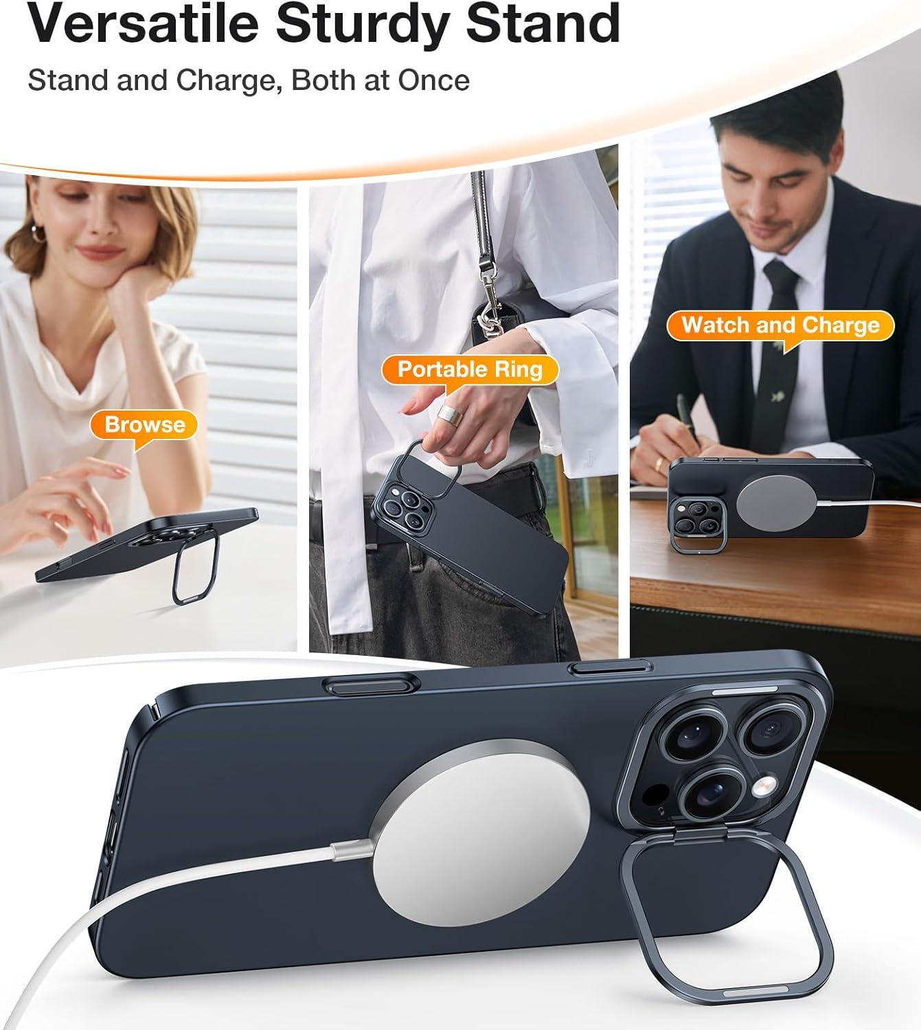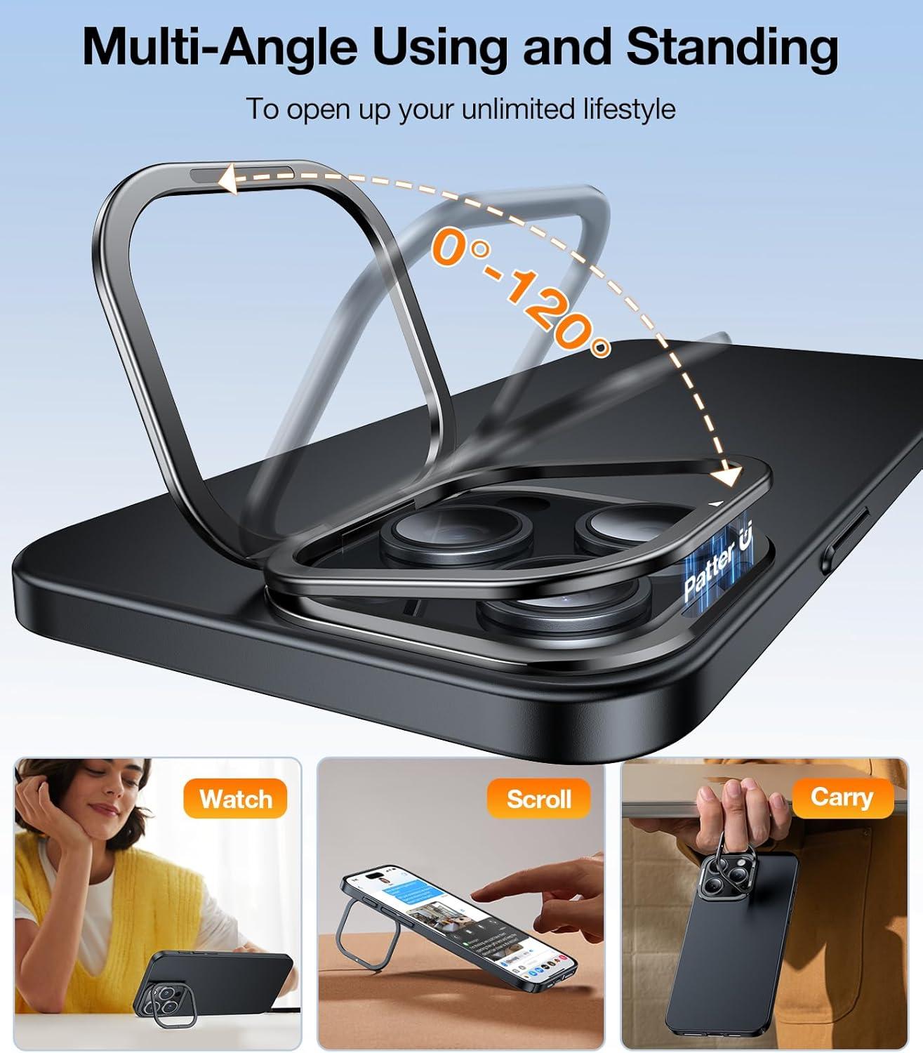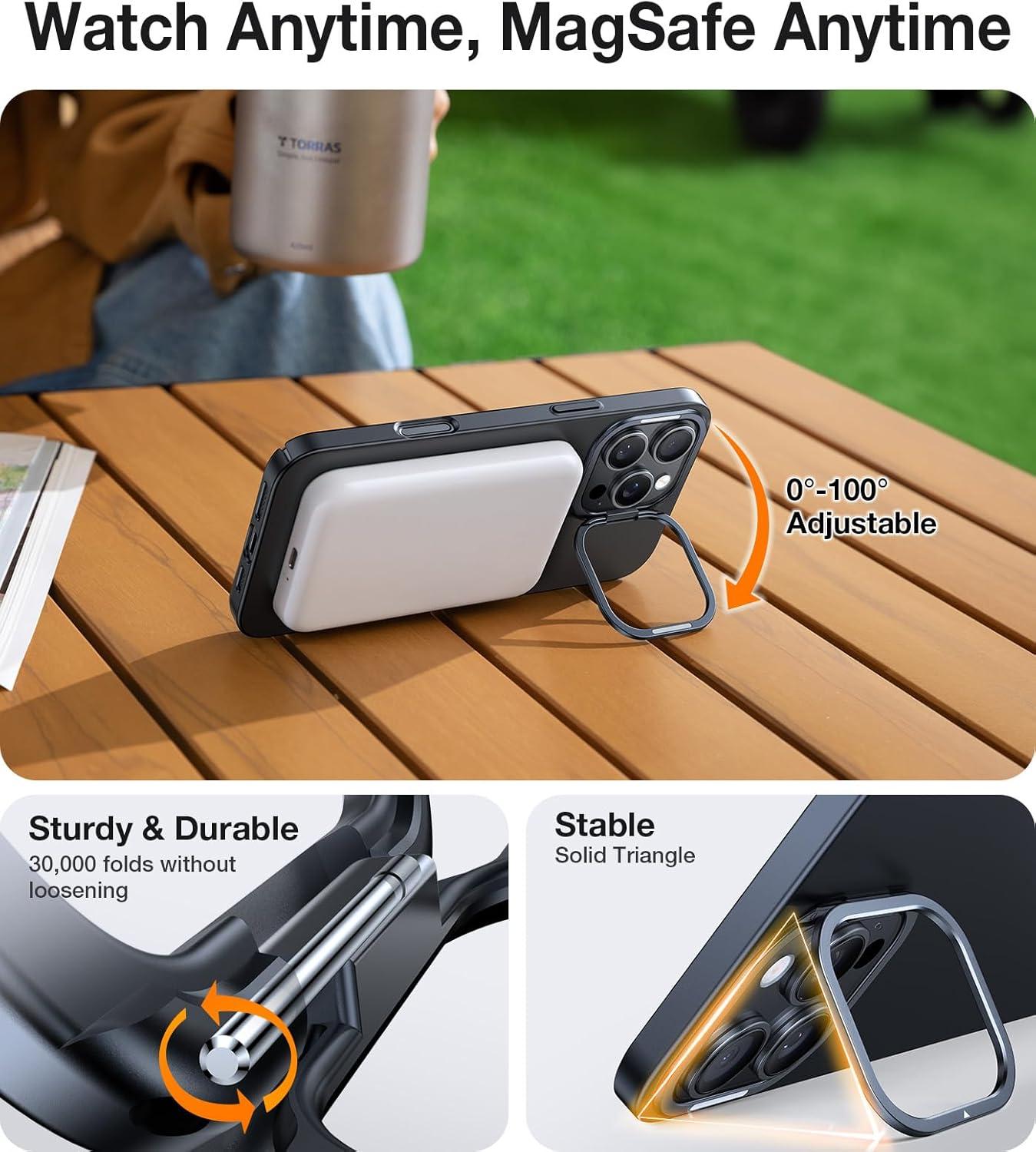 Built-in Camera Stand: The stand is made of durable aircraft-grade aluminum and its hinges are made of high-carbon steel and secured by three metal rivets to ensure its durability. TORRAS for iPhone 16 Pro stand case withstood over 30,000 rigorous folding tests. Positioned around the camera's bezel, it supports charging while playing; you can watch videos anytime, anywhere and enjoy a stable viewing angle that can be freely adjusted from 0° to 100°, and can be hidden when folded.