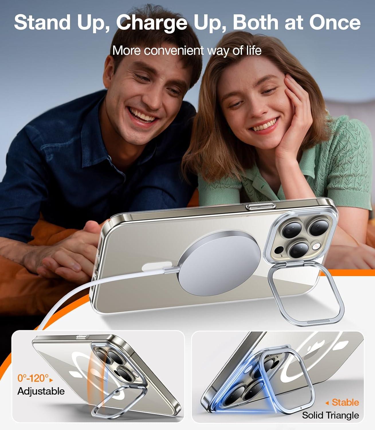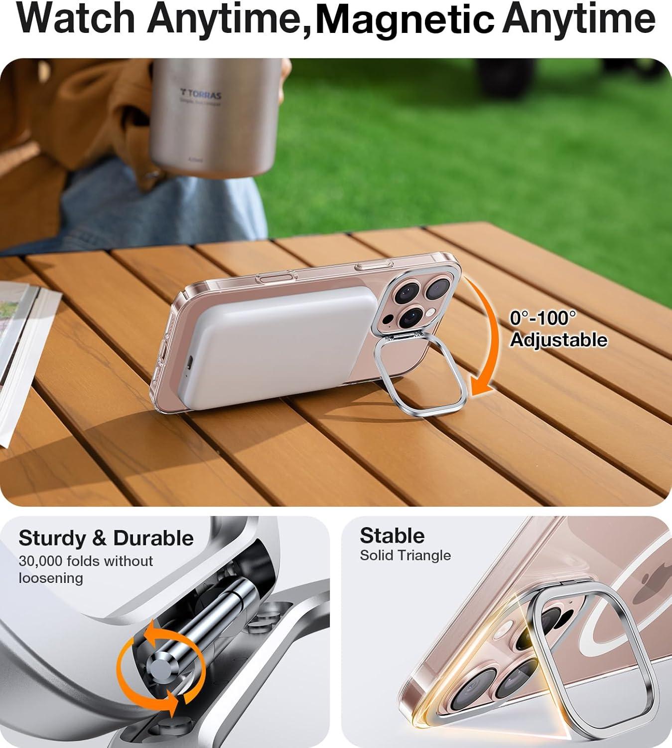Built-in Camera Stand: The stand is made of durable aircraft-grade aluminum and its hinges are made of high-carbon steel and secured by three metal rivets to ensure its durability. TORRAS for iPhone 16 Pro stand case withstood over 30,000 rigorous folding tests. Positioned around the camera's bezel, it supports charging while playing; you can watch videos anytime, anywhere and enjoy a stable viewing angle that can be freely adjusted from 0° to 100°, and can be hidden when folded.