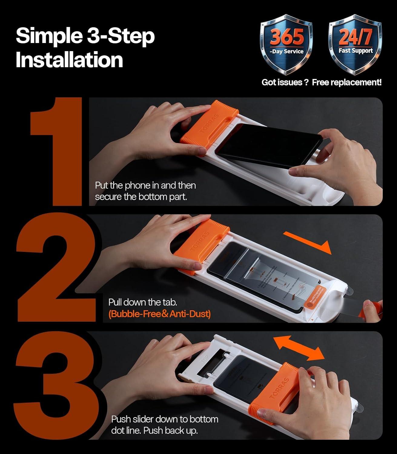[Simple 3-Step Installation, Bubble-Free & Anti-Dust] TORRAS’s innovative installation kit makes application effortless. Just “One Cover, One Pull, One Slide” – and you’ll apply the screen protector perfectly. No more worries about bubbles, misalignment, or dust. It’s the ideal choice for perfectionists. (If there are any bubbles, simply use the cleaning cloth to push them outwards to the edge.)