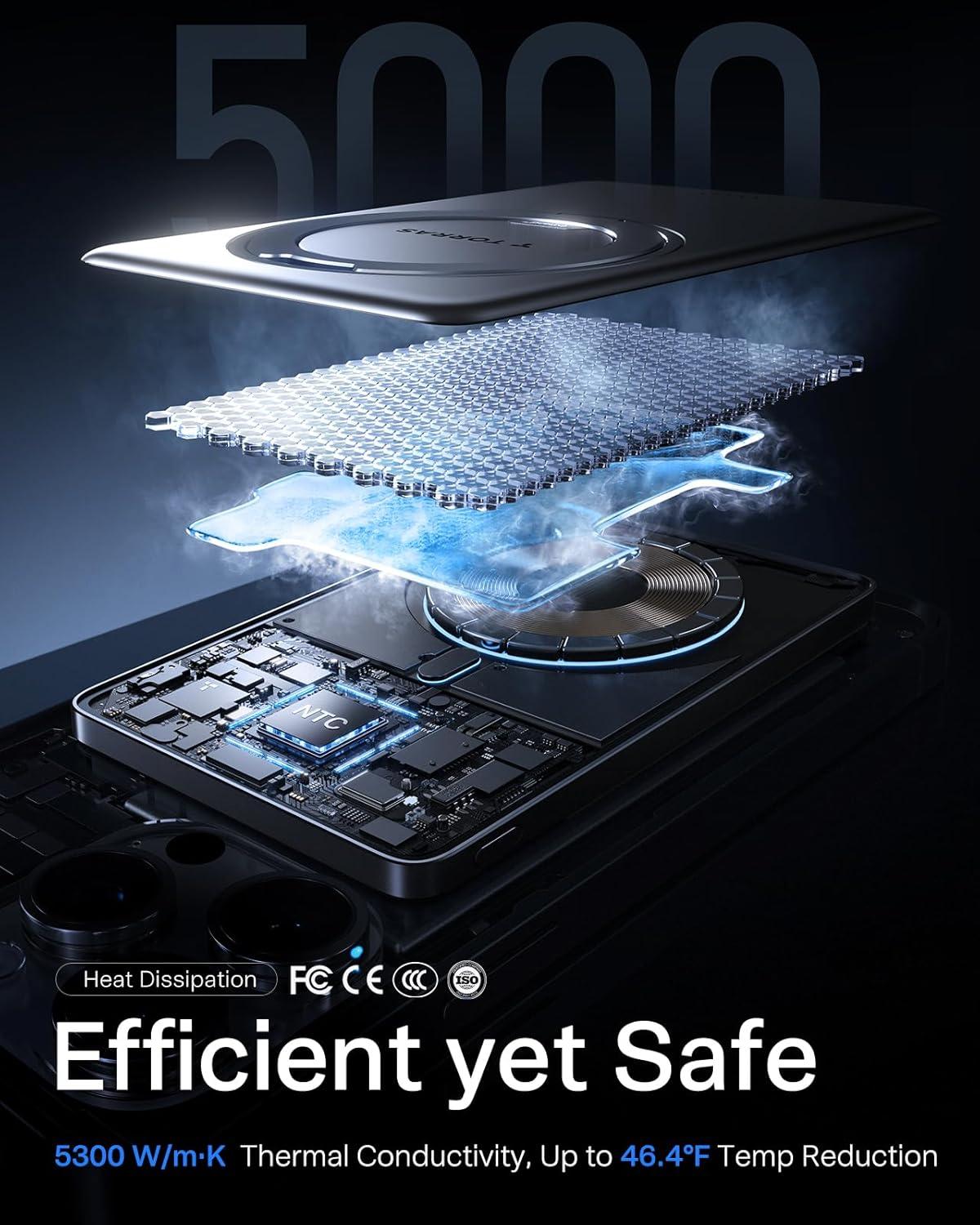 【Upgraded Power Core】Equipped with a high-capacity Li-polymer battery, dual graphene thermal control, and an NTC temp chip — delivering faster, safer charging. With 36,000 temperature checks per hour and 5300 W/m·K thermal conductivity, it stays up to 8°C cooler during fast charging. Your Safety Guardian, always reliable.