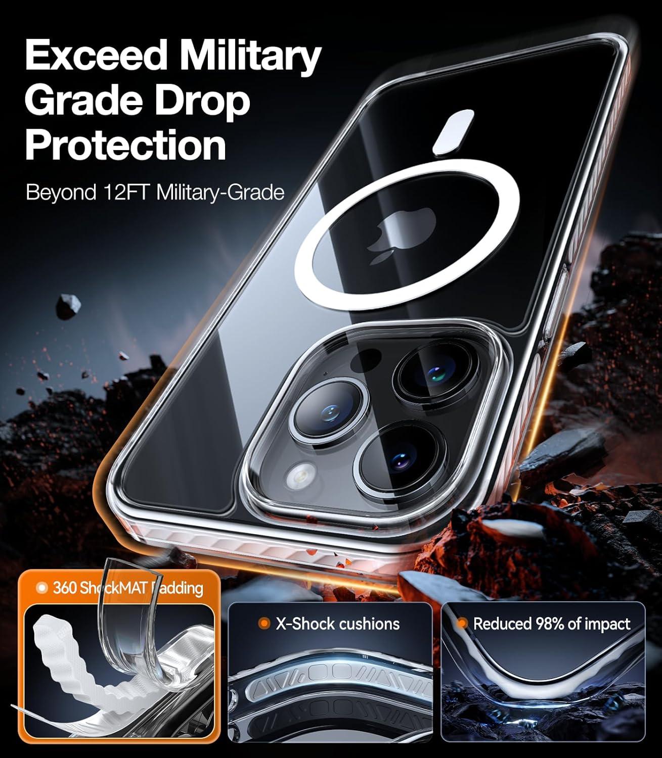 【Ultimate 12FT Military-Grade Tested】Surpassing the military standard threefold (Certified MIL-STD-810H). The iPhone 15 Pro Max case is crafted with highly elastic TPU and sturdy PC back for resilience against daily wear and tear. Equipped with built-in 360° powerful impact-absorbing airbags and the 3rd generation X-SHOCK anti-collision angle technology, it safeguards your phone from falls, collisions, and injuries whether face-up or face-down
