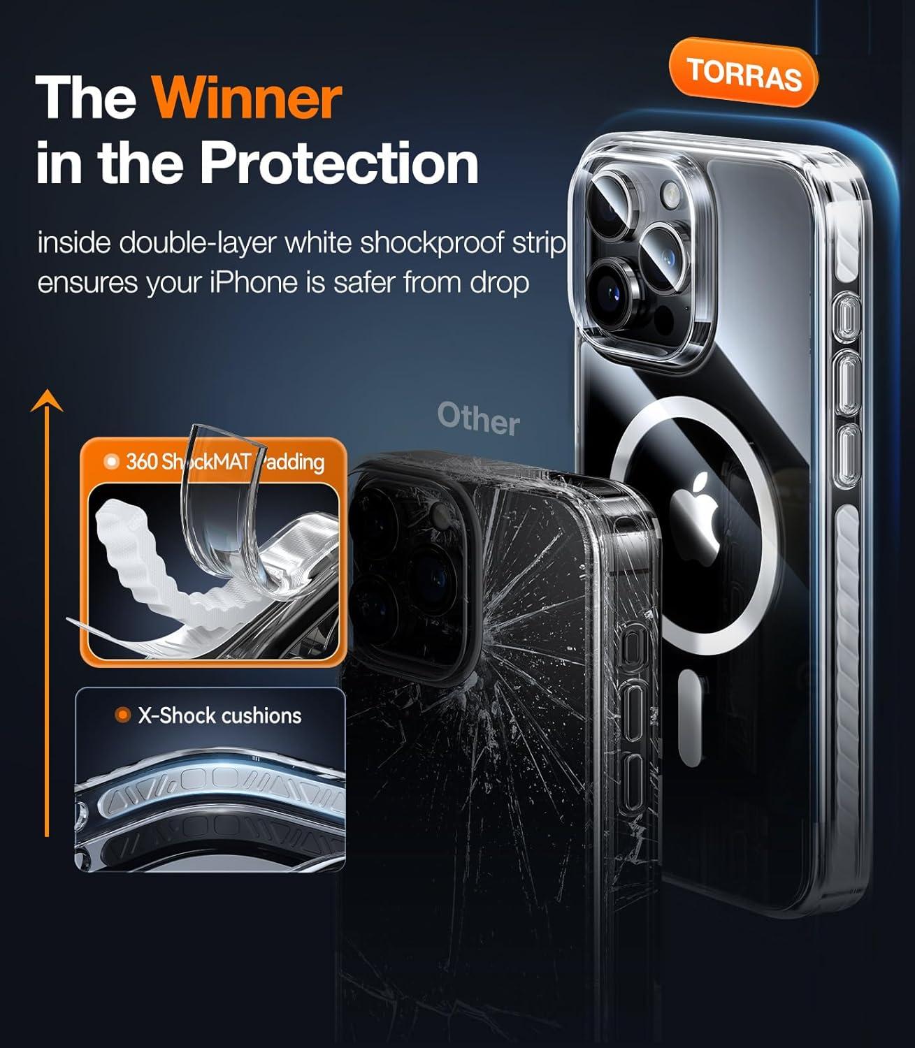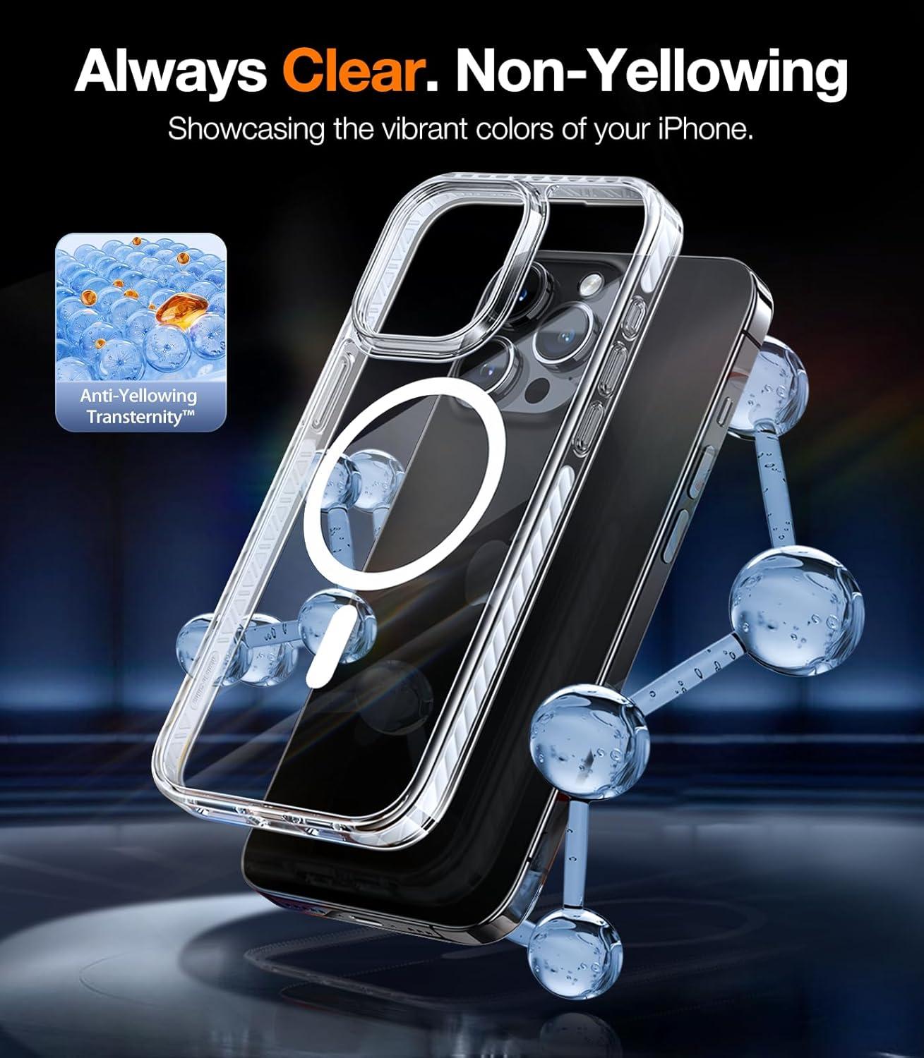 【Anti-Yellowing, Always Clear】 The clear iPhone 15 ProMax case features a crystal-clear back. Thanks to TORRAS' Transternity anti-yellowing technology, it effectively resists yellowing caused by 99.9% of UV rays, fingerprints, sweat, and more. This case will remain crystal clear for an extended period, preserving your phone's vivid colors, allowing you to enjoy your phone's original hue with ease
